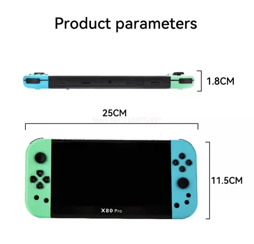 Esta consola de juegos portátil de alta definición Powkiddy X80 Pro tiene más de 20000 juegos integrados (16G), potente rendimiento y hardware, puede proporcionarte una experiencia de juego suave y una visualización de juego de alta definición. Dimensiones del producto: 23,6 x 11,7 x 1,4 cm. Peso del producto: 358 g. Material: ABS+ Componentes electrónicos RAM: LPDDR2 128M Memoria: 128M Sistema: Sistema Linux visualización: visualización IPS de 7 pulgadas, resolución: 1024 x 600 Función de imagen: JPG, JPEG, JPEG, JFormato de video PE, BMP, PNG: compatible con reproducción de video FLV MP4 Función de música: compatible con música sin pérdidas y audio de formato completo MP3 Función externa: altavoces dobles de alta calidad Batería: 3500 mAh Tarjeta TF: compatible con expansión de tarjeta TF, hasta 64 GB Otras características: Compatible con doble gamepad y auriculares estéreo de 3,5 mm. Contenido del paquete: 1 consola X80 Pro x cable USB-C. Manual 1xManual 1xManual manual Tarjeta TF de 16 GB (en consola)